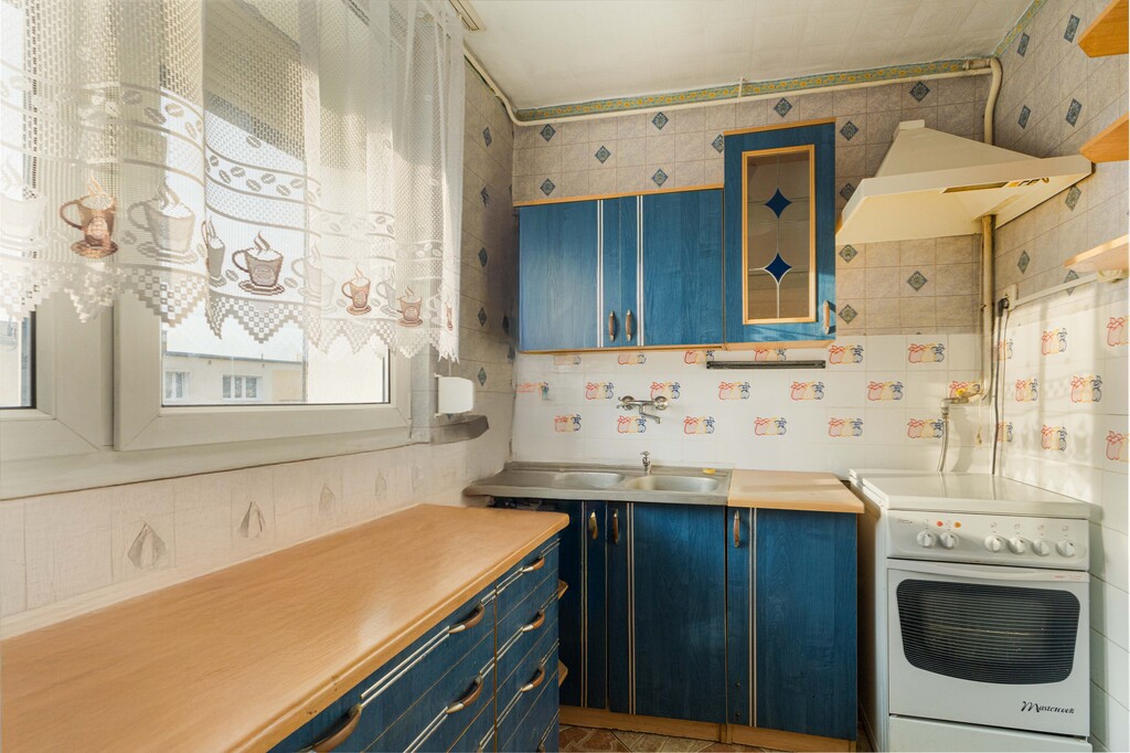 W mieszkaniu znajdują się meble kuchenne, oraz sprzęty.