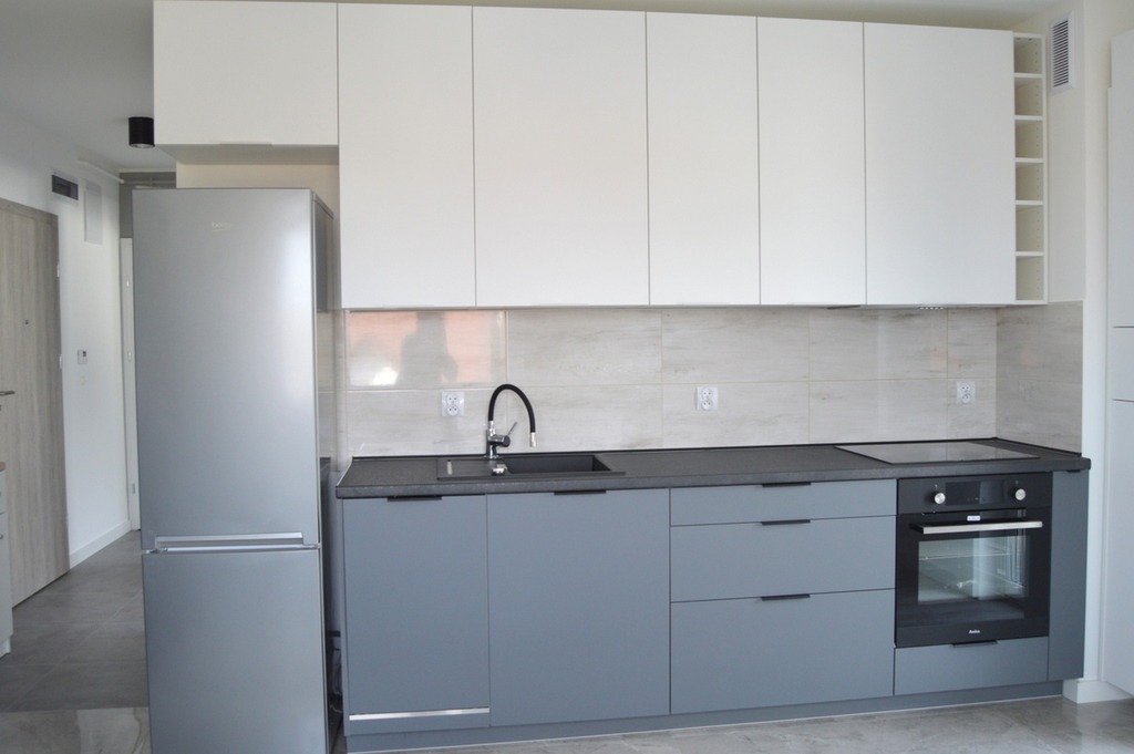 W mieszkaniu umeblowana kuchnia, w pełni wyposażona – także w AGD (lodówka, zmywarka, piekarnik itd.)