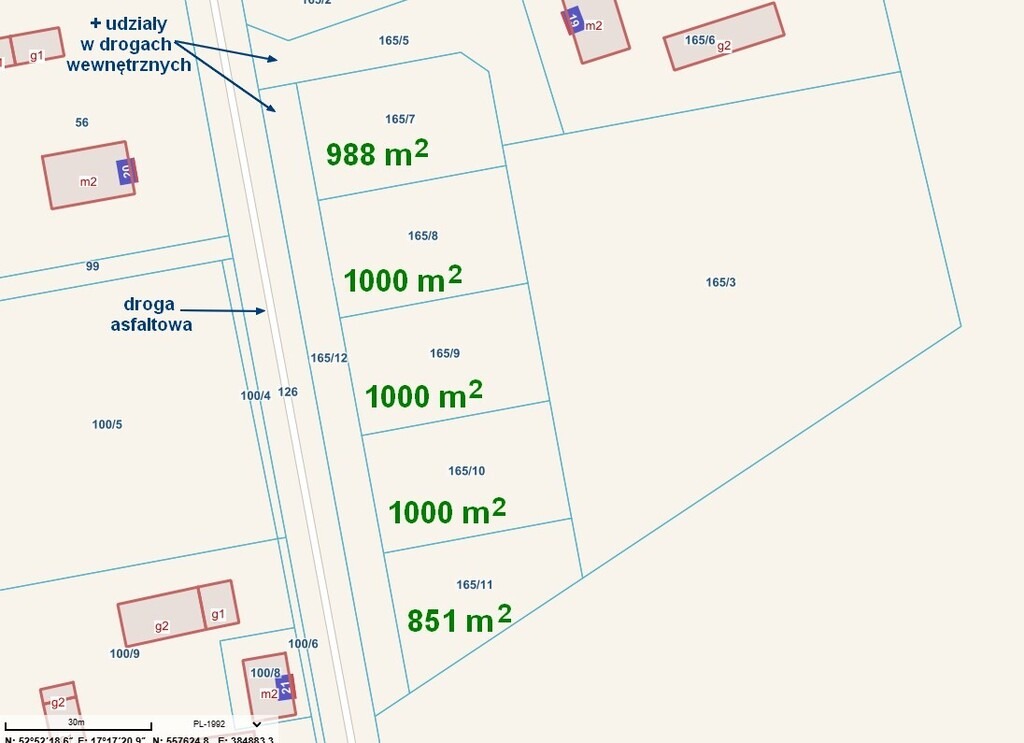 Dojazd do kompleksu działek drogą asfaltową (łączącą Wągrowiec i Kcynię), bezpośredni poprzez nabycie udziału w dwóch działkach wewnętrznych (w cenie działki).
